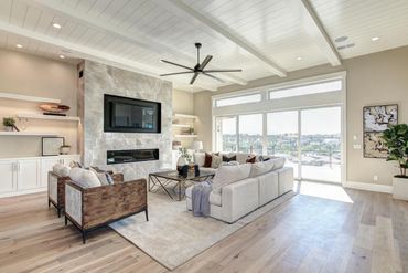 The great room features 16' tall ceilings and a floor to ceiling fireplace.